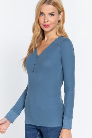 Get ready to stay warm and stylish with our Long Sleeve V-Neck Placket Thermal Top in Steel Blue. Add it to your cart now and experience the perfect blend of fashion and comfort!