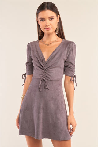 Charcoal Grey Suede Deep Plunge V-neck Gathered Detail Tight Fit Mini Dress