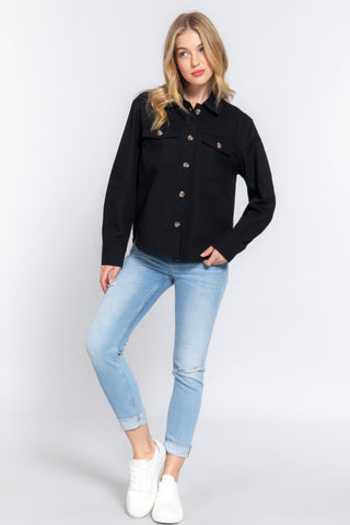 Elevate your wardrobe with our Button Down Cotton Denim Shacket in classic black. Add versatility and timeless style to your look with this essential piece!