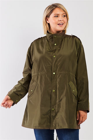 Plus Size Glossy Drawstring Hem Button-down Coach Jacket - 3XL