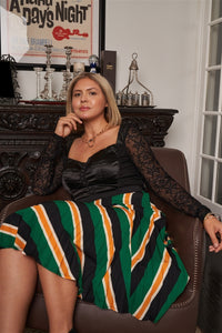Elevate your evening wardrobe with our Plus Black Satin Corset Front Sweetheart Neck Long Lace Sleeve Detail Crop Top, available in sizes 1XL, 2XL, and 3XL. This alluring piece seamlessly combines a corset front with luxurious satin fabric and intricate lace sleeve details, making it the perfect addition to your fall/winter collection.