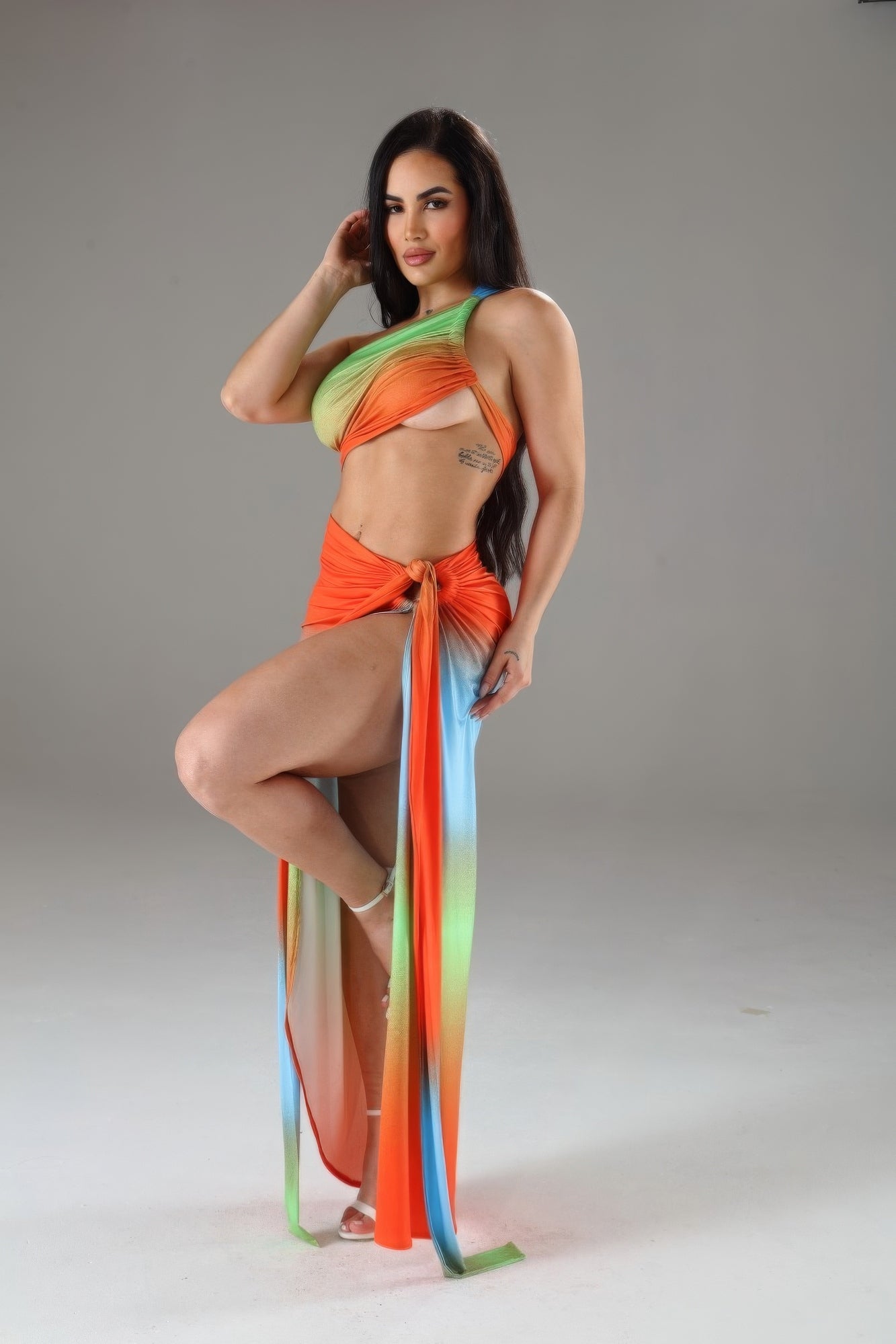 Design: The set features a crop top and a matching skirt with a side slit and a self-fabric belt tie for a customizable fit and added style.