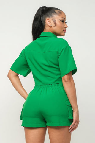 Front Button Down Side Pockets Top And Shorts Set - S